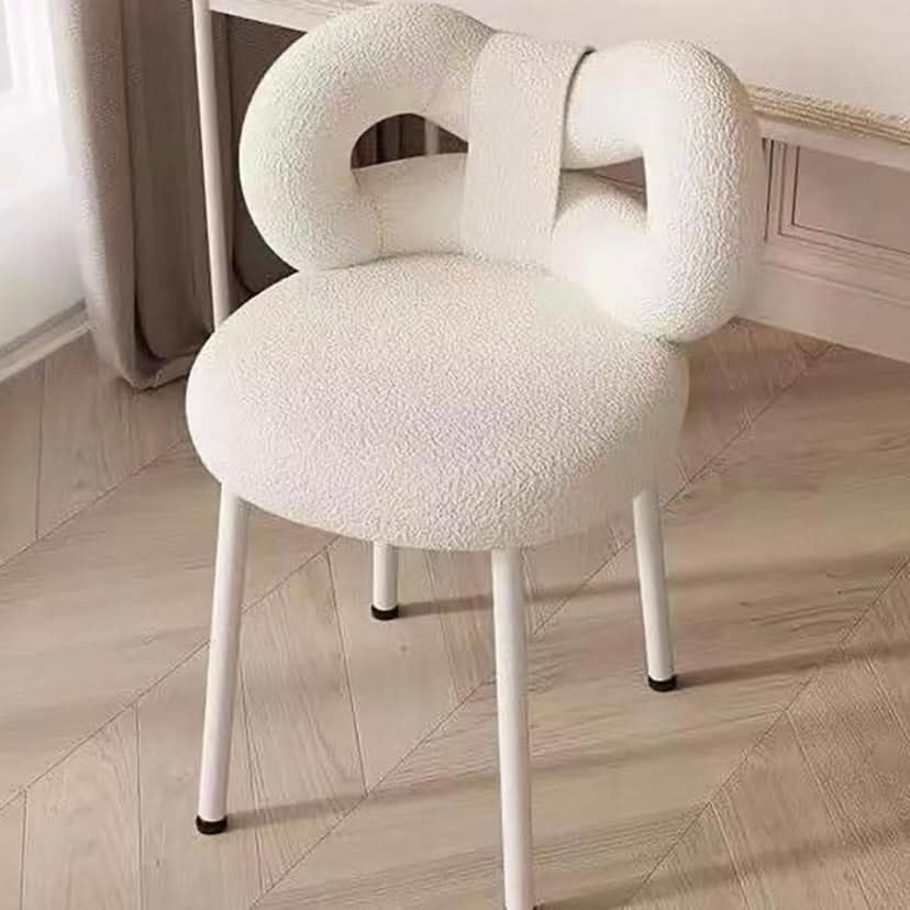 تتميز هذه الكرسي بتصميم فريد وغير تقليدي، حيث تحتوي على مقعد دائري ومسند ظهر متشابك مما يخلق تأثيرًا بصريًا مثيرًا. الكرسي مغطى بقماش أبيض، مما يضيف إلى مظهره العصري والأنيق. الأرجل نحيلة وتضيق نحو الأسفل، مع أغطية سوداء واقية على كل قدم لمنع تلف الأرضية. هذه الكرسي تبرز بفضل شكلها الإبداعي ويمكن أن تكون قطعة مميزة في تصميم الديكور الداخلي
