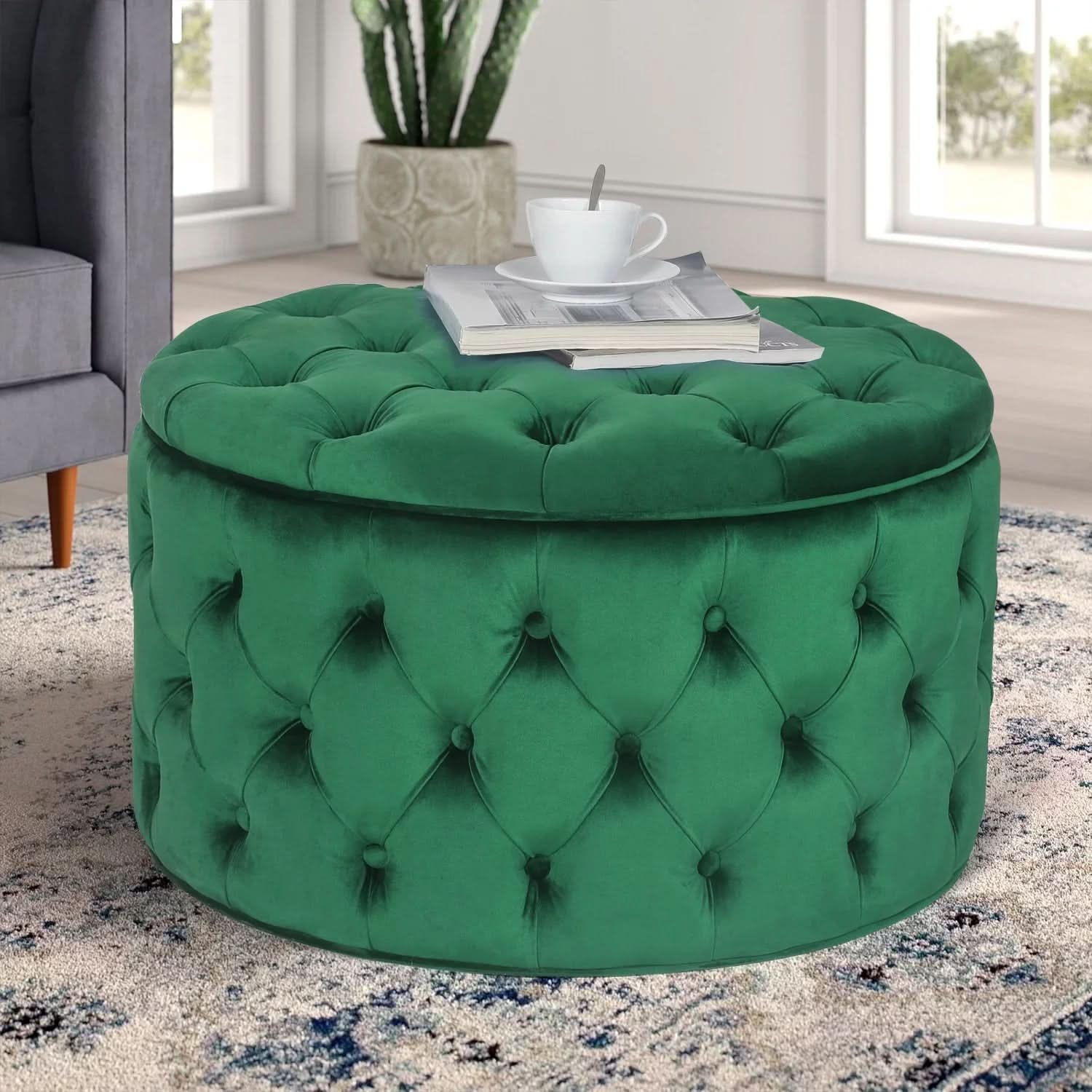 بوف سحارة دائري، مصنوع من خشب زان الذي يوفر المتانة و الأستدامة و إسفنح سوفت و قماش قطيفة، مما يجعل المقعد مصمم بشكل مريح و ناعم، فيمكنك وضعه بأي مكان ببيتك ليعطيك لمسة أناقة فاخرة، حيث أنه أيضا تستطيع تخزين بعض الأغراض بداخلة ليوفر لك التنظيم و الترتيب.