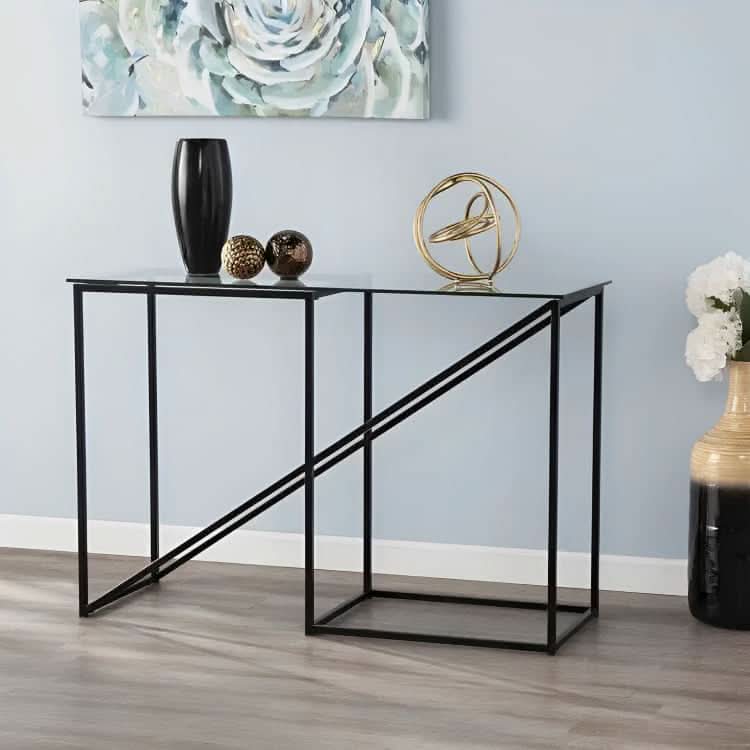 كونسول بشكل مبتكر و عصري يناسب جميع أنواع الديكورات المنزلية، مصنوع من اجود انواع الستيل المتين و دهانات اليكتروستاتيك مقاومة للصدأ والخدوش والرطوبة بالإضافة إلى سطح زجاجي مميز ، يمكن استخدامه في مداخل البيت أو غرف المعيشة، ليضيف لمسة فخمة وأنيقة إلى منزلك، متوفر بالوان هيكل متعددة لتساعدك على اختيار اللون المناسب لمنزلك.