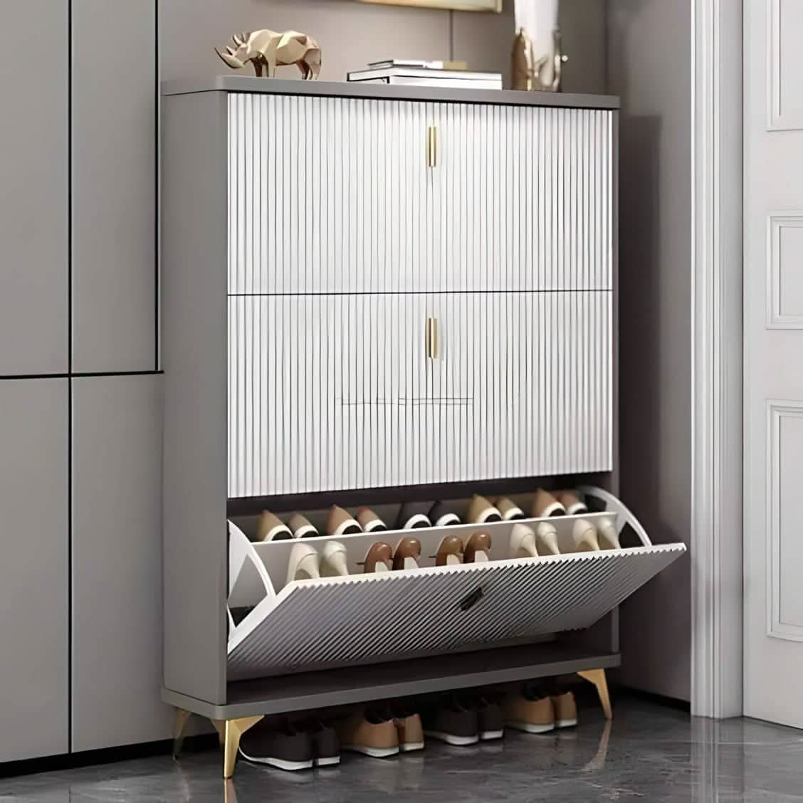 اكتشف جمال التنظيم مع هذه خزانة الأحذية المصنوعة من خشب ام دي اف بجودة عالية ، تأتي بتصميم أنيق بالألوان الأبيض والرمادي . تقدم هذه الجزامة حلاً مثالياً لتخزين الأحذية بطريقة عملية وعصرية، حيث تجمع بين الجمال والوظيفة.