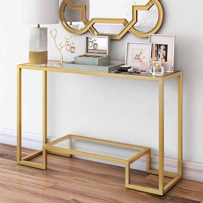 كونسول بتصميم أنيق يفتن النظر، بأرجل ذهبية تضفي عليها الأناقة والجمال، إضافة إلى سطحها الزجاجي المتين الذي يجعلها مثالية للتزيين وتخزين الأشياء الهامة في المنزل، كما أنها مزودة برف سفلي زجاجي، يمكنك استخدامه كقطعة فريدة من نوعها لتحديث ديكور منزلك.