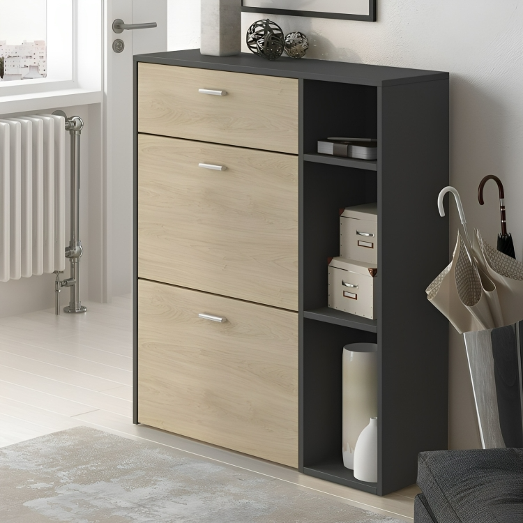 خزانة الأحذية هذه تجمع بين الأناقة والوظائف المتعددة. مصنوعة من خشب ام دي اف اسباني عالي الجودة، تتميز بمظهر حديث يضيف لمسة من الرقي إلى ديكور منزلك. تأتي مجهزة بدرجين متحركين لسهولة الوصول وتخزين الأحذية بشكل منظم، بالإضافة إلى درج أمامي ورفوف جانبية لتوفير مساحة تخزين إضافية. احصل عليها للحفاظ على منزلك منظماً ونظيفاً.