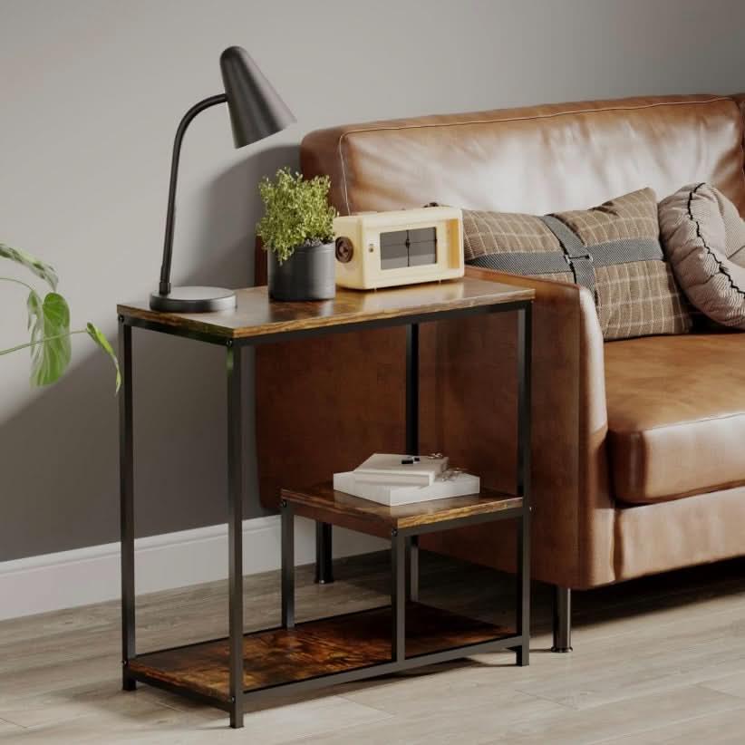 طاولة جانبية بتصميم عصري، تتكون من هيكل معدني أسود اللون ورفوف من الخشب بلون بني. تحتوي على رف علوي وآخر سفلي يقدمان مساحة كافية للاستخدامات المتعددة. الطاولة ذات شكل مستطيل وأبعاد مناسبة لتكون بجانب الأرائك أو الكراسي. تصميمها بسيط وأنيق، يجعلها قطعة مثالية لإضافة لمسة جمالية وعملية في غرف المعيشة.