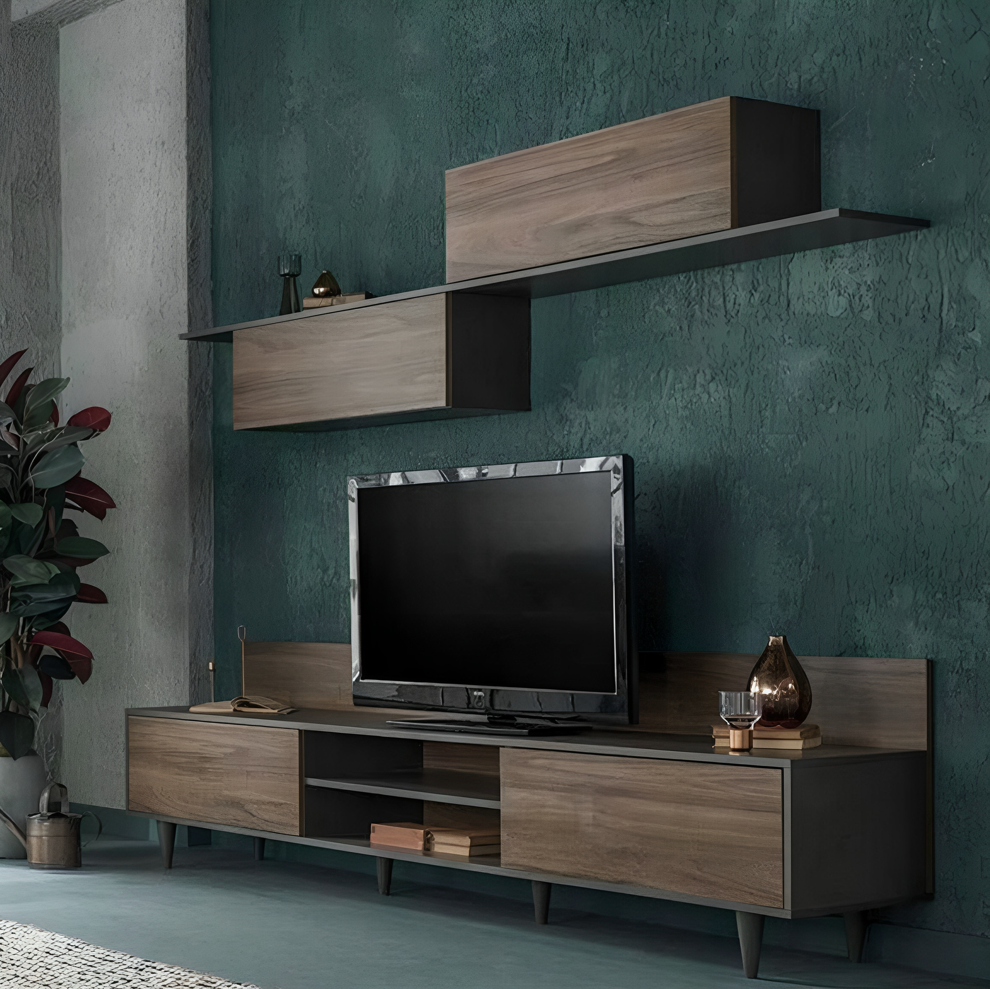 ترابيزة تليفزيون بتصميم مميز، تم صنعها من الخشب ام دي اف ، مما يجعلها قوية وتدوم لفترة طويلة. تتميز بانها مزودة بوحدة علوية، مصممة بدرجان مستطيلان و التي تتناسب مع معظم أنماط الديكور الداخلي. يتميز اللون الخشبي الغامق مع الأسود الذي يضيف لمسة من الأناقة على غرفة المعيشة. كما أنها تحتوي على مساحات تخزين مختلفة، مما يجعلها مثالية لتخزين أجهزة التلفزيون والأشياء الأخرى.